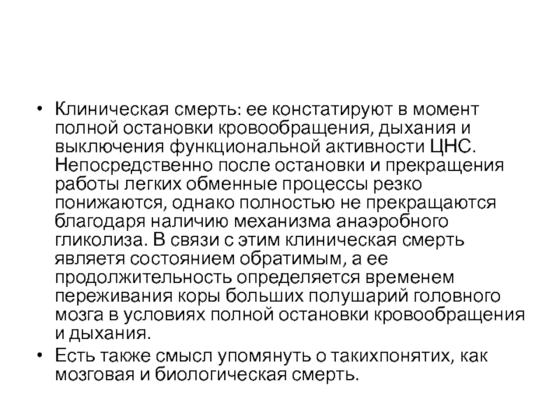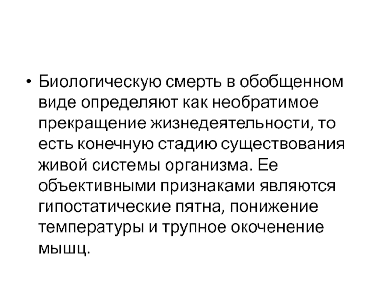 Слайд 7Биологическую смерть в обобщенном виде определяют как необратимое прекращение жизнедеятельности,