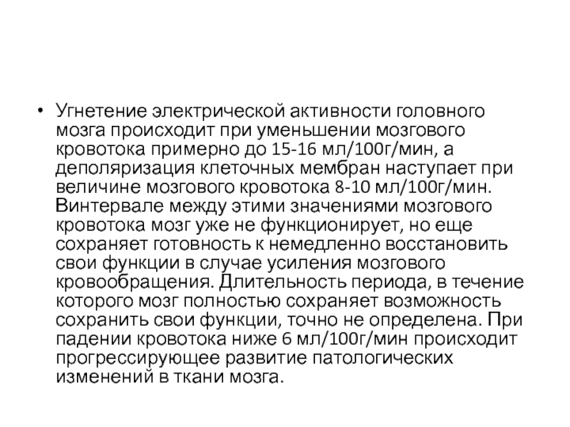 Слайд 14Угнетение электрической активности головного мозга происходит при уменьшении мозгового кровотока
