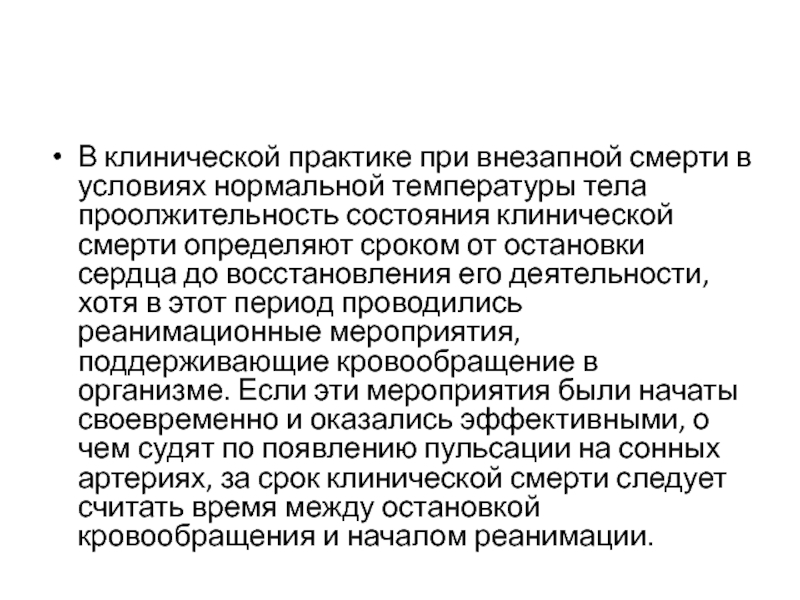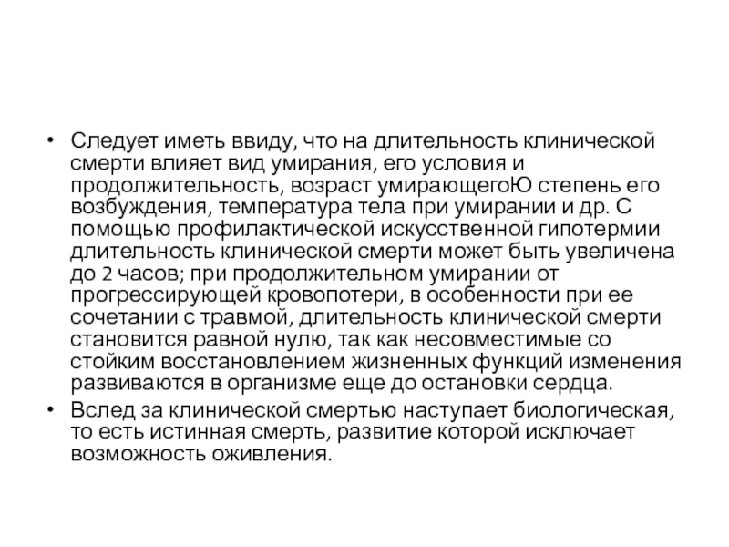 температура тела при умирании и др. С помощью профилактической искусственной гипотермии длительность клинической смерти может быть увеличена до 2 часов; при продолжительном умирании от прогрессирующей кровопотери, в особенности при ее сочетании с травмой, длительность клинической смерти становится равной нулю, так как несовместимые со стойким восстановлением жизненных функций изменения развиваются в организме еще до остановки сердца.