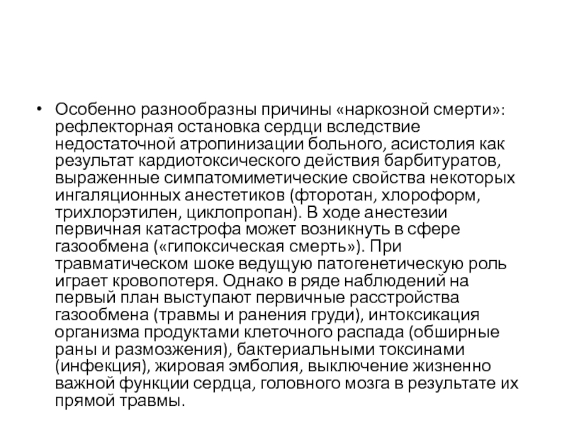 Слайд 9Особенно разнообразны причины «наркозной смерти»: рефлекторная остановка сердци вследствие недостаточной