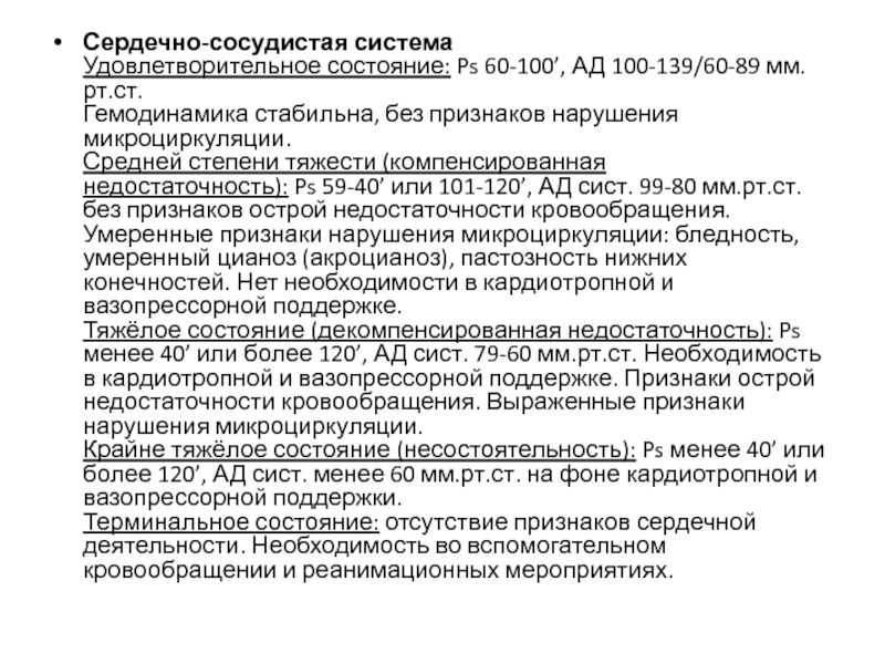 Тяжёлое состояние (декомпенсированная недостаточность): Ps менее 40’ или более 120’, АД сист. 79-60 мм.рт.ст. Необходимость в кардиотропной и вазопрессорной поддержке. Признаки острой недостаточности кровообращения. Выраженные признаки нарушения микроциркуляции.