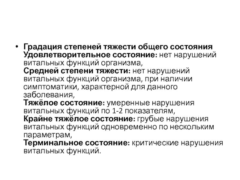 степени тяжести: нет нарушений витальных функций организма, при наличии симптоматики, характерной