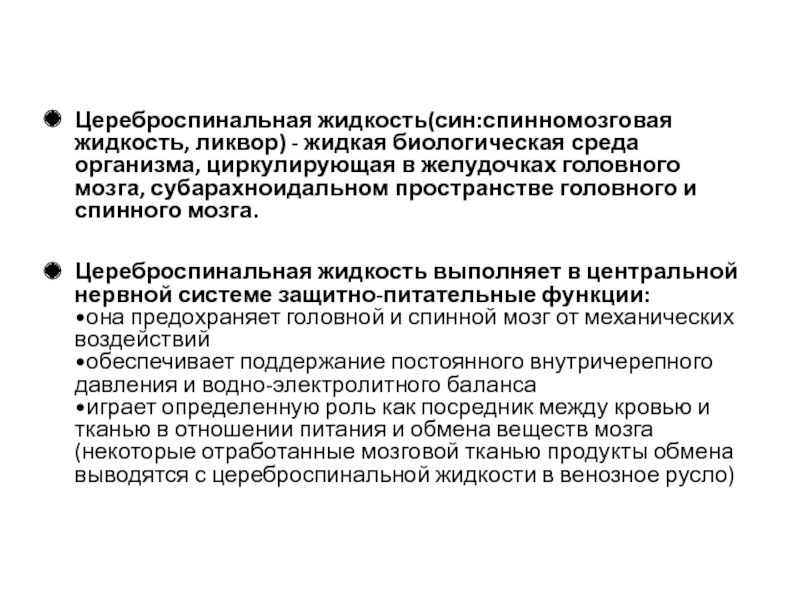 Слайд 11Цереброспинальная жидкость(син:спинномозговая жидкость, ликвор) - жидкая биологическая среда организма, циркулирующая