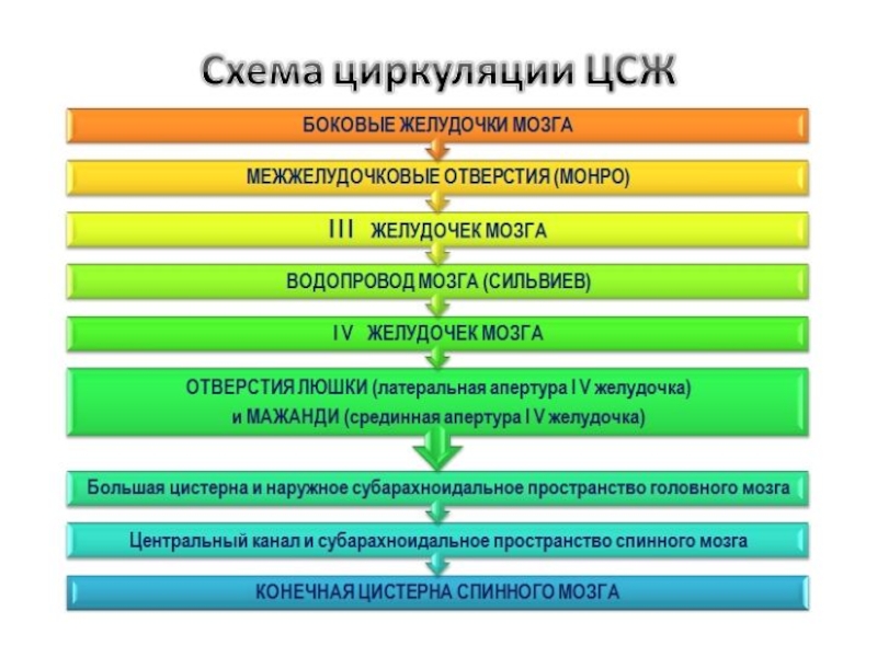 В субарахноидальном пространстве ликвор циркулирует вверх и вокруг головного мозга и вниз вокруг спинного мозга