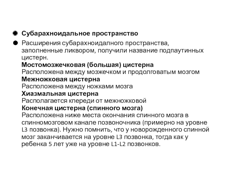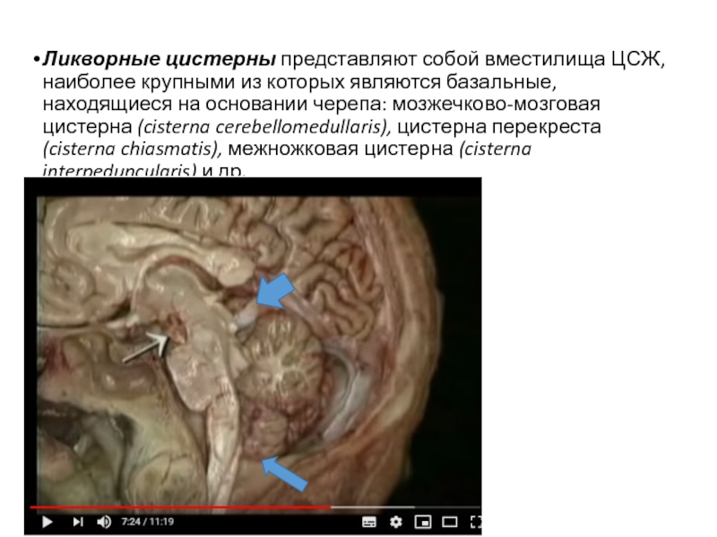 Слайд 7Ликворные цистерны представляют собой вместилища ЦСЖ, наиболее крупными из которых являются