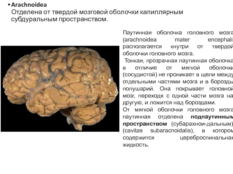 мозга (arachnoidea mater encephali) располагается кнутри от твердой оболочки головного