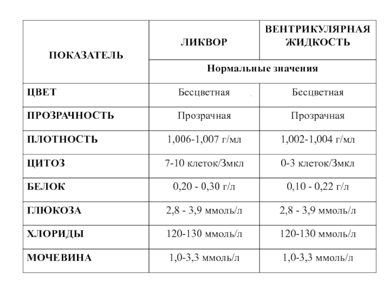 содержит очень мало клеток (около 2 на 50—53 мм) и мало белка (25—40 мг/100 мл)