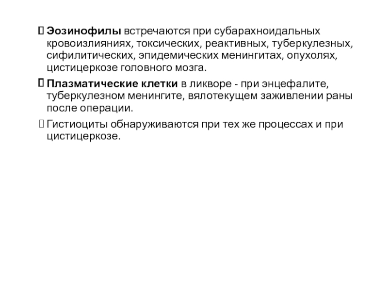 Слайд 21Эозинофилы встречаются при субарахноидальных кровоизлияниях, токсических, реактивных, туберкулезных, сифилитических, эпидемических