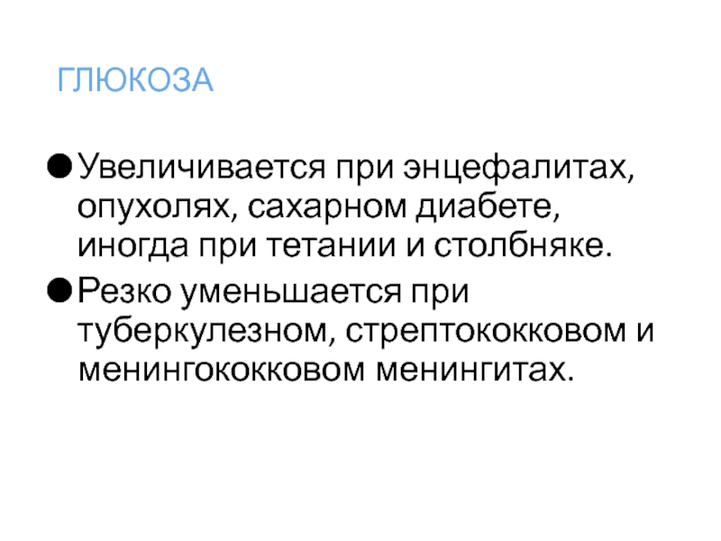 Резко уменьшается при туберкулезном, стрептококковом и менингококковом менингитах.