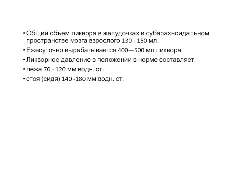 Слайд 15Общий объем ликвора в желудочках и субарахноидальном пространстве мозга взрослого