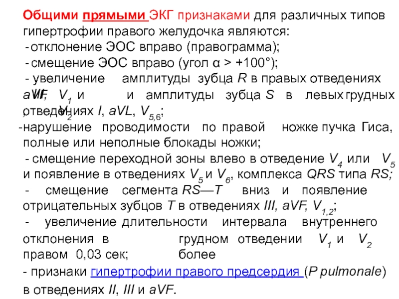 Слайд 14Общими прямыми ЭКГ признаками для различных типов гипертрофии правого желудочка