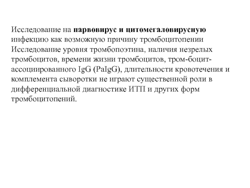 Слайд 26Исследование на парвовирус и цитомегаловирусную инфекцию как возможную причину тромбоцитопении