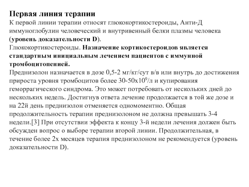 Преднизолон назначается в дозе 0,5-2 мг/кг/сут в/в или внутрь до достижения прироста уровня тромбоцитов более 30-50х109/л и купирования геморрагического синдрома. Это может потребовать от нескольких дней до нескольких недель. Достигнув ответа лечение продолжается в той же дозе и на 22й день преднизолон отменяется одномоментно. Общая продолжительность терапии преднизолоном не должна превышать 3-4 недели.[3] При отсутствии эффекта к концу 3-й недели лечения должен быть обсужден вопрос о выборе терапии второй линии. Продолжительная, в течение более 2х месяцев терапия преднизолоном не рекомендуется (уровень доказательности D).