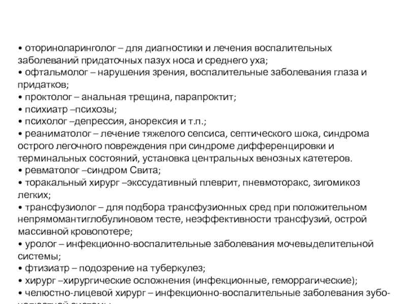 • трансфузиолог – для подбора трансфузионных сред при положительном непрямомантиглобулиновом тесте, неэффективности трансфузий, острой массивной кровопотере;