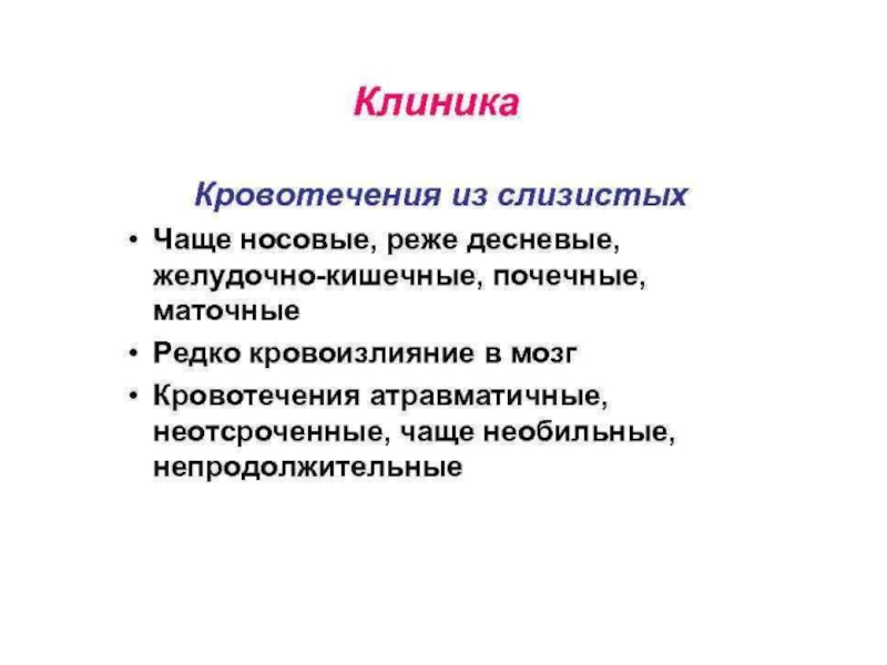 может быть заподозрена у пациентов с длительно сохраняющейся тром-боцитопенией при отсутствии эффекта от лечения, а также с семейным анамнезом, отягощенным тромбоцито-пенией или наличием кровотечений у кровных родственников.