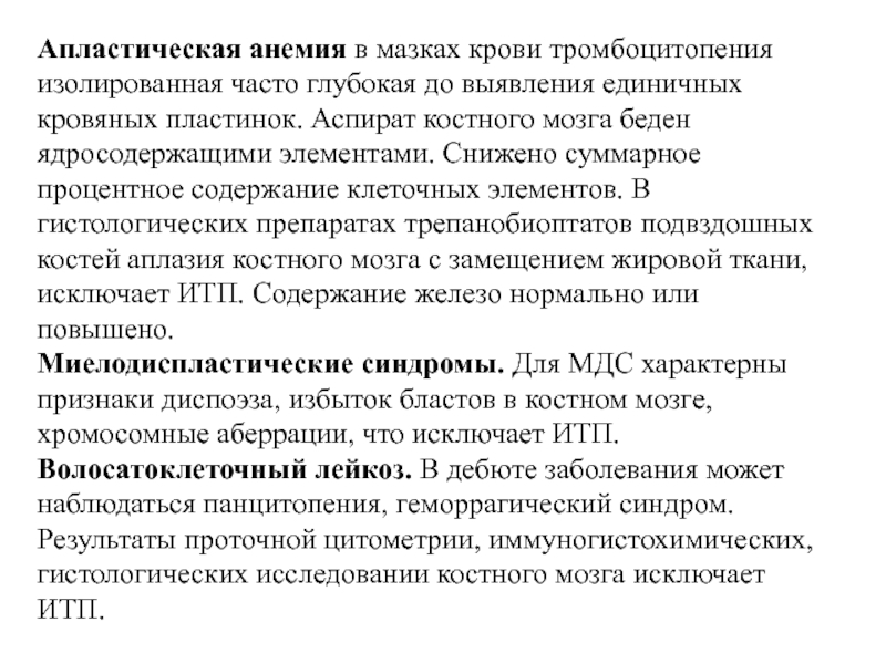 Волосатоклеточный лейкоз. В дебюте заболевания может наблюдаться панцитопения, геморрагический синдром. Результаты проточной цитометрии, иммуногистохимических, гистологических исследовании костного мозга исключает ИТП.