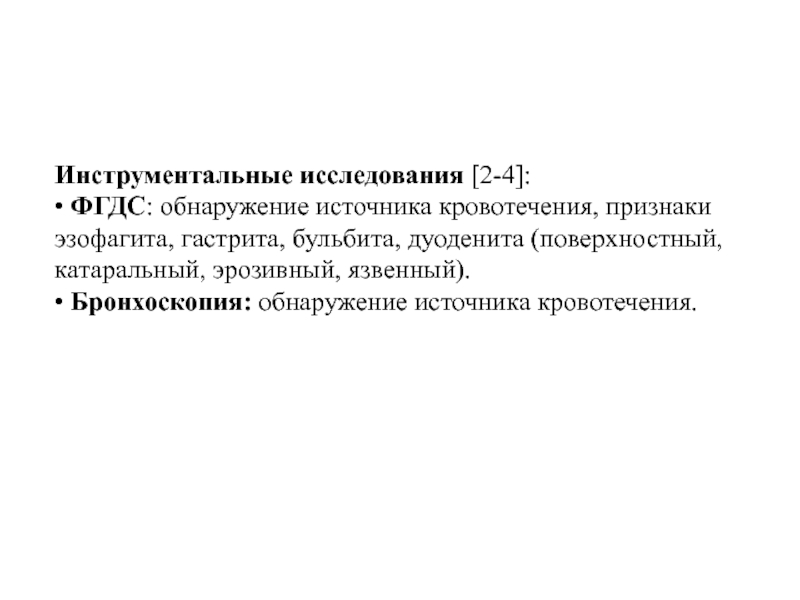 • ФГДС: обнаружение источника кровотечения, признаки эзофагита,