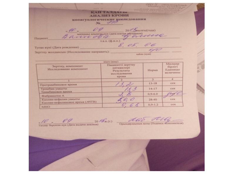 Пароксизмальная ночная гемоглобинурия. Для ПНГ характерны гемосидеринурия, гемоглобинурия, повышение уровней билирубина, ЛДГ, снижение либо отсутствие гаптоглобина. Кровоточивость редко наблюдается, типична гиперкоагуляция (активация индукторов агрегации). Исключается при отсутствии ПНГ клона по результатам ИФТ.