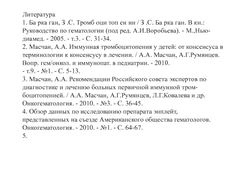 2. Масчан, А.А. Иммунная тромбоцитопения у детей: от консенсуса в терминологии к консенсусу в лечении. / А.А. Масчан, А.Г.Румянцев. Вопр. гем/онкол. и иммунопат. в педиатрии. - 2010.