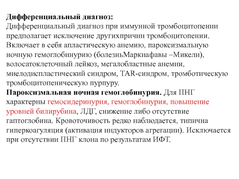 Дифференциальный диагноз при иммунной тромбоцитопении предполагает исключение другихпричин