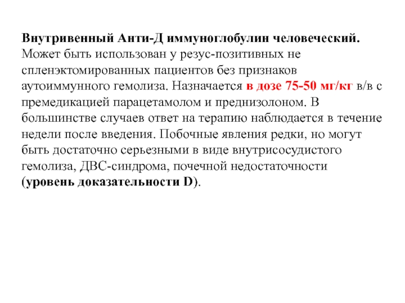 Слайд 36Внутривенный Анти-Д иммуноглобулин человеческий. Может быть использован у резус-позитивных не