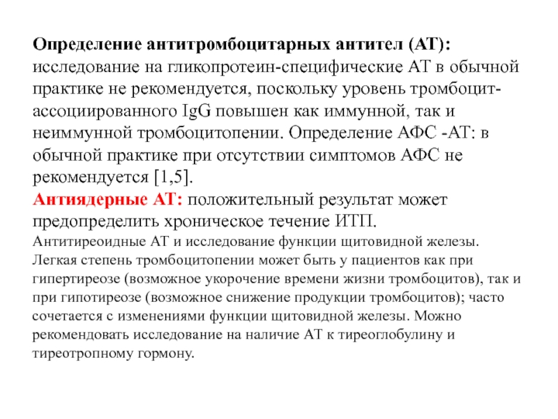 Антитиреоидные АТ и исследование функции щитовидной железы. Легкая степень тромбоцитопении может быть у пациентов как при гипертиреозе (возможное укорочение времени жизни тромбоцитов), так и при гипотиреозе (возможное снижение продукции тромбоцитов); часто сочетается с изменениями функции щитовидной железы. Можно рекомендовать исследование на наличие АТ к тиреоглобулину и тиреотропному гормону.
