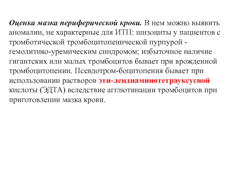 - гемолитико-уремическим синдромом; избыточное наличие гигантских или малых тромбоцитов бывает при врожденной тромбоцитопении. Псевдотром-боцитопения бывает при использовании растворов эти-лендиаминотетрауксусной кислоты (ЭДТА) вследствие агглютинации тромбоцитов при приготовлении мазка крови.