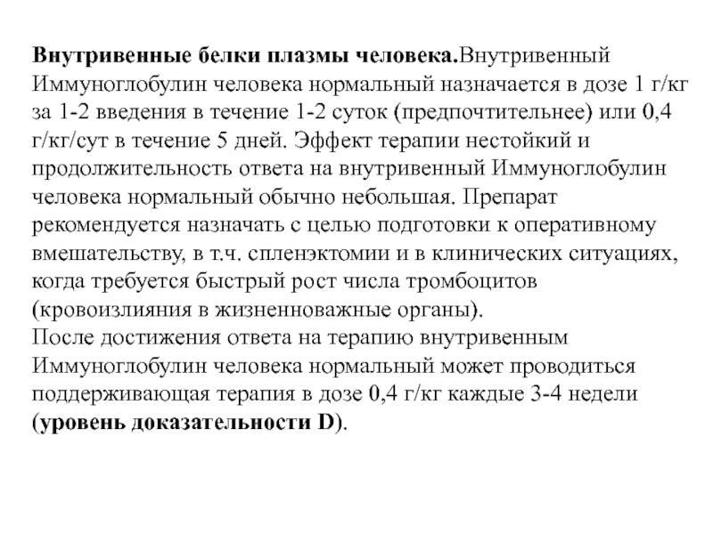или 0,4 г/кг/сут в течение 5 дней. Эффект терапии нестойкий и продолжительность ответа на внутривенный Иммуноглобулин человека нормальный обычно небольшая. Препарат рекомендуется назначать с целью подготовки к оперативному вмешательству, в т.ч. спленэктомии и в клинических ситуациях, когда требуется быстрый рост числа тромбоцитов (кровоизлияния в жизненноважные органы).