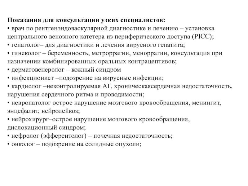 • кардиолог –неконтролируемая АГ, хроническаясердечная недостаточность, нарушения сердечного ритма и проводимости;