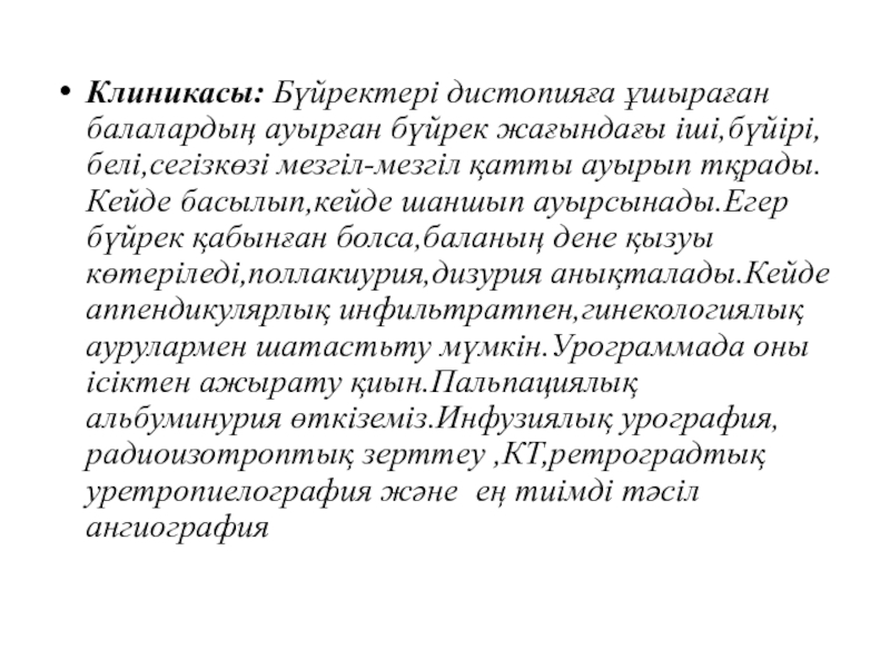 Слайд 32Клиникасы: Бүйректері дистопияға ұшыраған балалардың ауырған бүйрек жағындағы іші,бүйірі,белі,сегізкөзі мезгіл-мезгіл