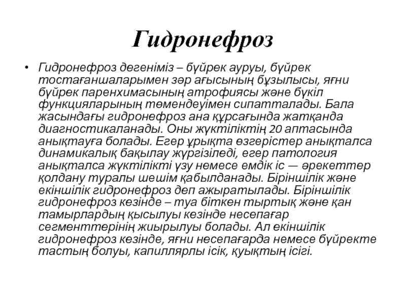 Гидронефроз дегеніміз – бүйрек ауруы, бүйрек тостағаншаларымен зәр ағысының бұзылысы,