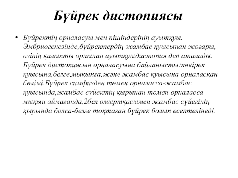 орнынан ауытқуыдистопия деп аталады.Бүйрек дистопиясын орналасуына байланысты:көкірек қуысына,белге,мықынға,және жамбас қуысына
