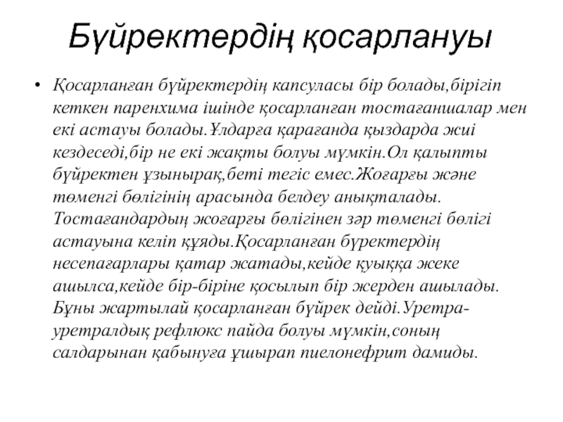 Қосарланған бүйректердің капсуласы бір болады,бірігіп кеткен паренхима ішінде қосарланған