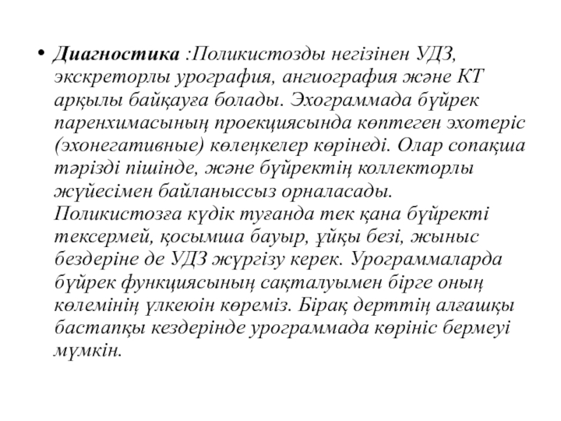 Слайд 24Диагностика :Поликистозды негізінен УДЗ, экскреторлы урография, ангиография және КТ арқылы
