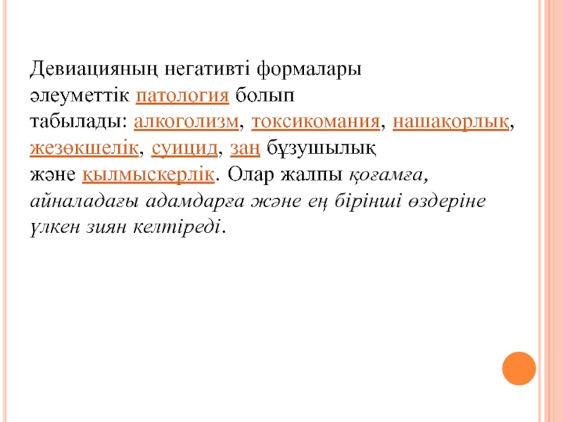Слайд 14Девиацияның негативті формалары әлеуметтік патология болып табылады: алкоголизм, токсикомания, нашақорлық, жезөкшелік, суицид, заң бұзушылық және қылмыскерлік. Олар жалпы қоғамға, айналадағы адамдарға
