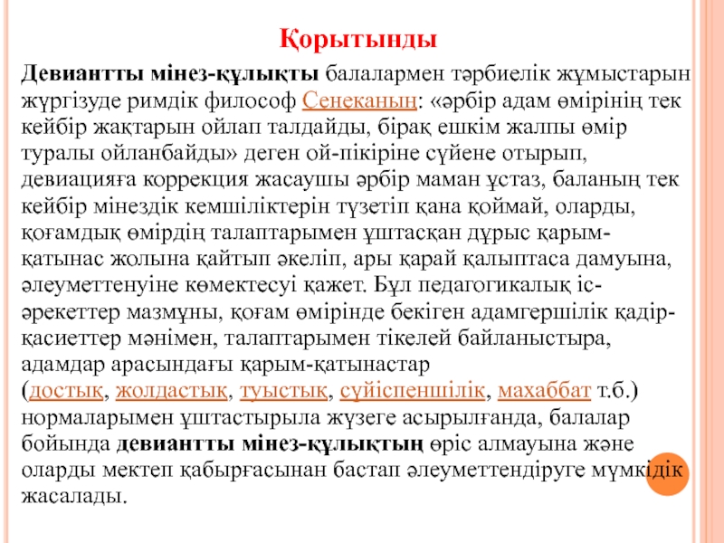 мінез-құлықты балалармен тәрбиелік жұмыстарын жүргізуде римдік философ Сенеканың: «әрбір адам өмірінің тек кейбір жақтарын ойлап талдайды, бірақ ешкім жалпы өмір туралы ойланбайды» деген ой-пікіріне сүйене отырып, девиацияға коррекция жасаушы әрбір маман ұстаз, баланың тек кейбір мінездік кемшіліктерін түзетіп қана қоймай, оларды, қоғамдық өмірдің талаптарымен ұштасқан дұрыс қарым-қатынас жолына қайтып әкеліп, ары қарай қалыптаса дамуына, әлеуметтенуіне көмектесуі қажет. Бұл педагогикалық іс-әрекеттер мазмұны, қоғам өмірінде бекіген адамгершілік қадір-қасиеттер мәнімен, талаптарымен тікелей байланыстыра, адамдар арасындағы қарым-қатынастар (достық, жолдастық, туыстық, сүйіспеншілік, махаббат т.б.) нормаларымен ұштастырыла жүзеге асырылғанда, балалар бойында девиантты мінез-құлықтың өріс алмауына және оларды мектеп қабырғасынан бастап әлеуметтендіруге мүмкідік жасалады.