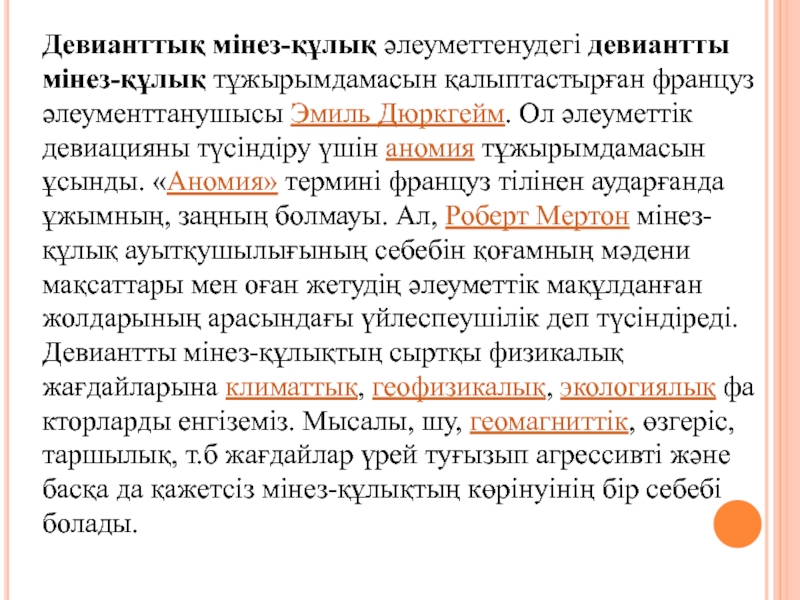 Слайд 6Девианттық мінез-құлық әлеуметтенудегі девиантты мінез-құлық тұжырымдамасын қалыптастырған француз әлеументтанушысы Эмиль Дюркгейм. Ол әлеуметтік девиацияны