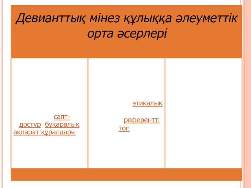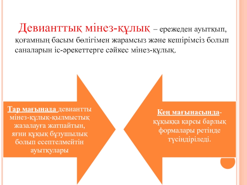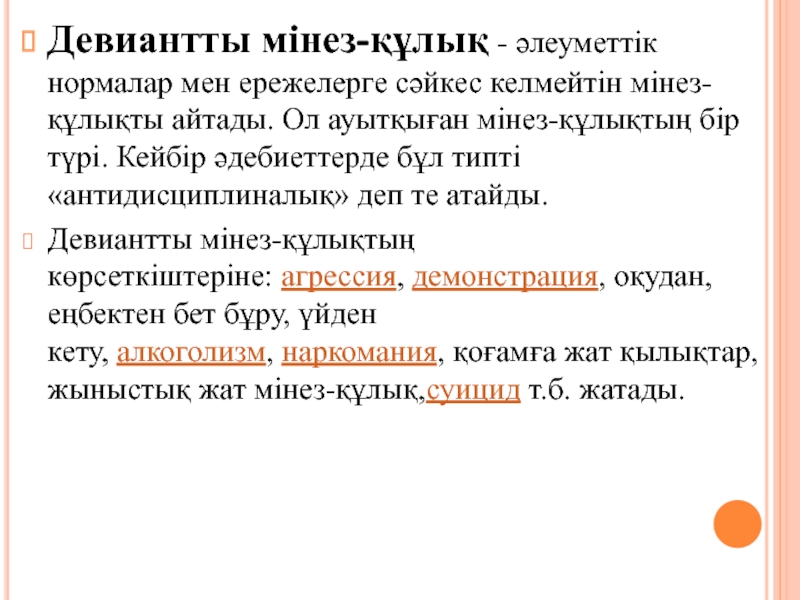 Слайд 11Девиантты мінез-құлық - әлеуметтік нормалар мен ережелерге сәйкес келмейтін мінез-құлықты айтады.