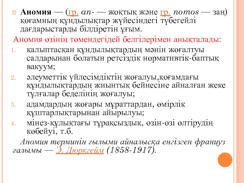 Слайд 7Аномия — (гр. an- — жоқтық және гр. nomos — заң) қоғамның құндылықтар жүйесiндегi түбегейлi дағдарыстарды