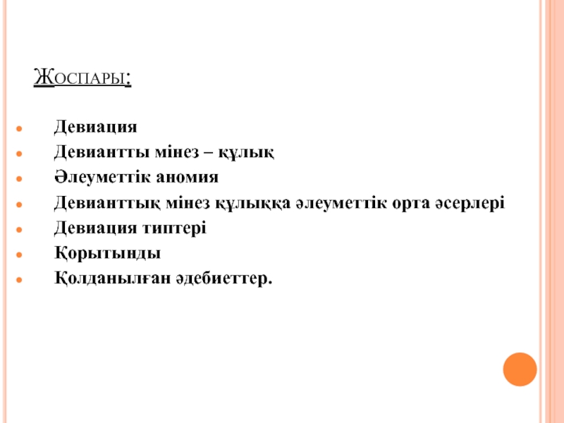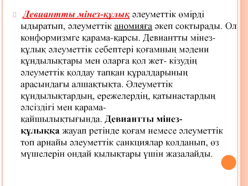 Слайд 5 Девиантты мінез-құлық әлеуметтік өмірді ыдыратып, әлеуметтік аномияға әкеп соқтырады. Ол конформизмге