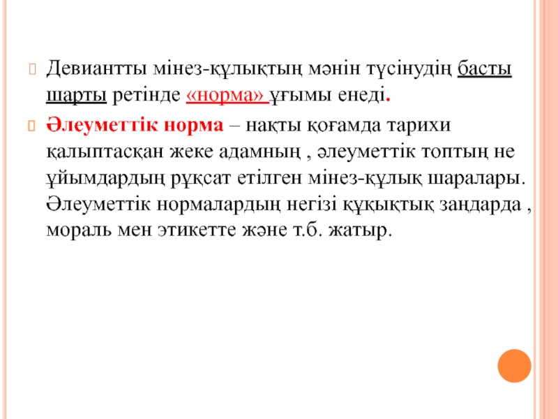 Слайд 8Девиантты мінез-құлықтың мәнін түсінудің басты шарты ретінде «норма» ұғымы енеді.