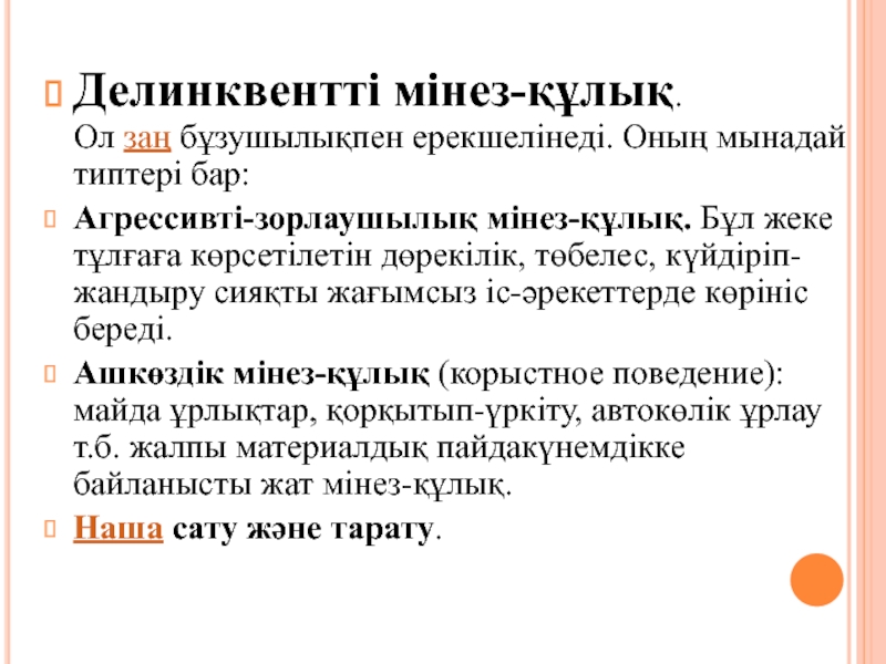 Слайд 12Делинквентті мінез-құлық. Ол заң бұзушылықпен ерекшелінеді. Оның мынадай типтері бар: