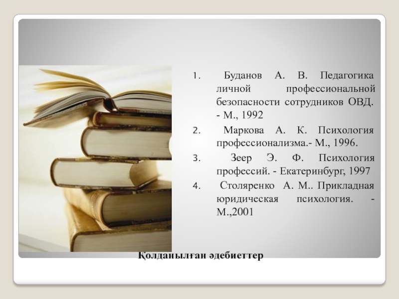 Қолданылған әдебиеттер Буданов А. В. Педагогика личной профессиональной безопасности сотрудников ОВД. - М., 1992 Маркова А. К.