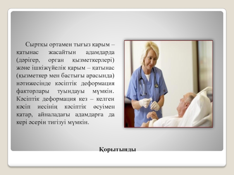 ҚорытындыСыртқы ортамен тығыз қарым – қатынас жасайтын адамдарда (дәрігер, орган қызметкерлері) және ішкіжүйелік қарым – қатынас (қызметкер
