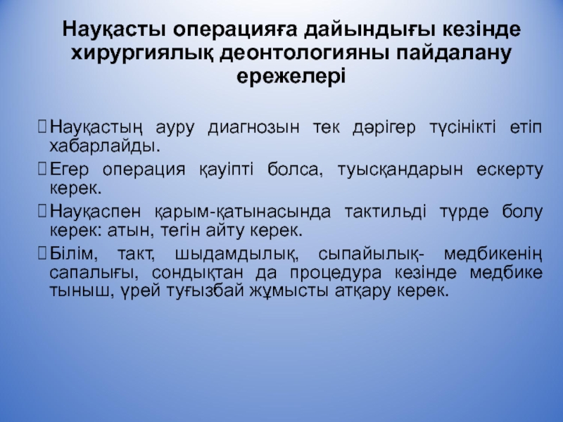 Слайд 8Науқасты операцияға дайындығы кезінде хирургиялық деонтологияны пайдалану ережелері