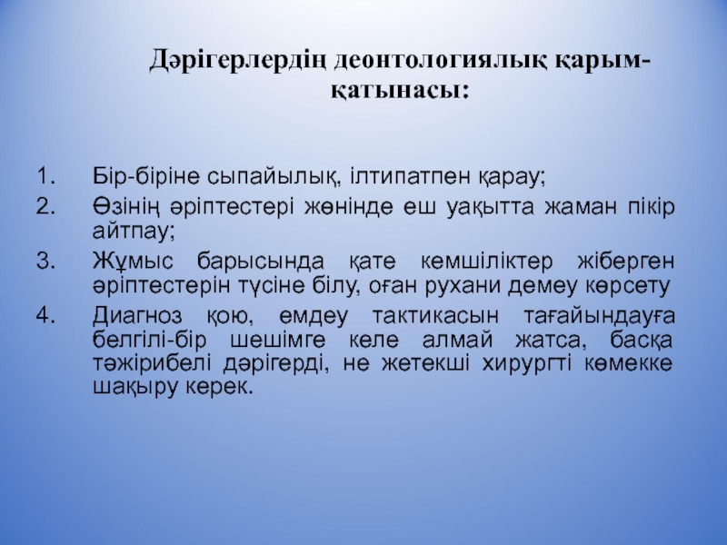 Слайд 6Дәрігерлердің деонтологиялық қарым-қатынасы: