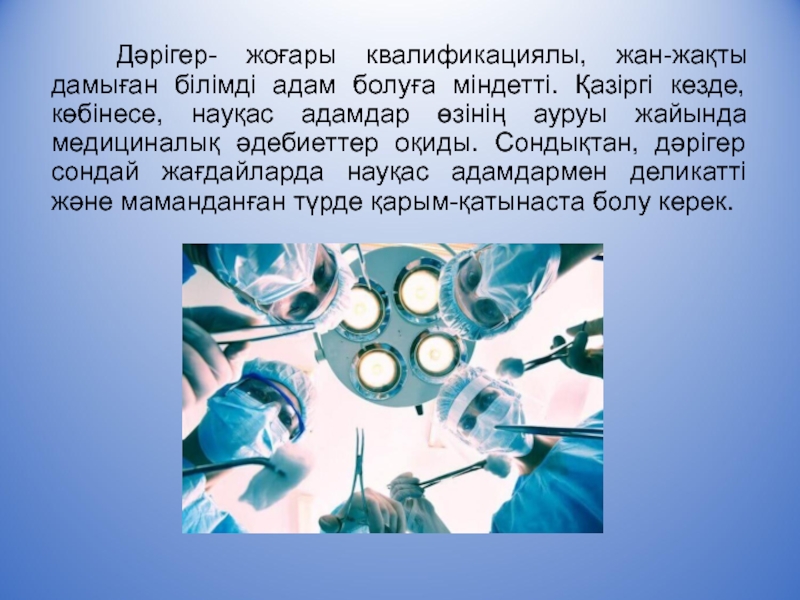 Слайд 7 Дәрігер- жоғары квалификациялы, жан-жақты дамыған білімді адам болуға міндетті. Қазіргі