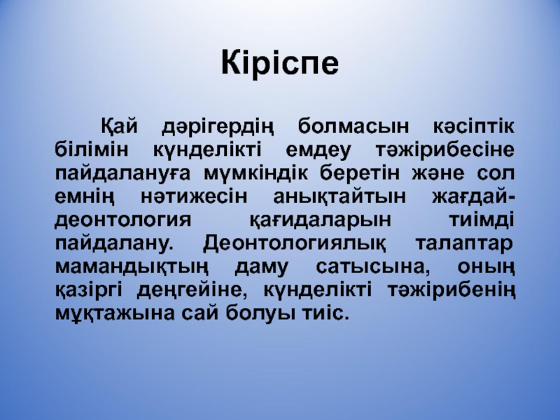 пайдалану. Деонтологиялық талаптар мамандықтың даму сатысына, оның қазіргі деңгейіне, күнделікті тәжірибенің мұқтажына сай болуы тиіс.