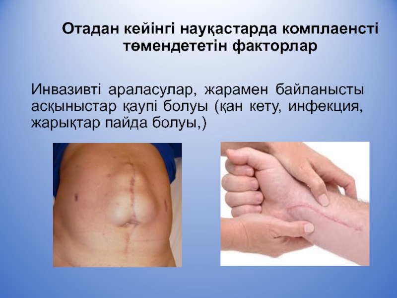 Слайд 9Отадан кейінгі науқастарда комплаенсті төмендететін факторлар