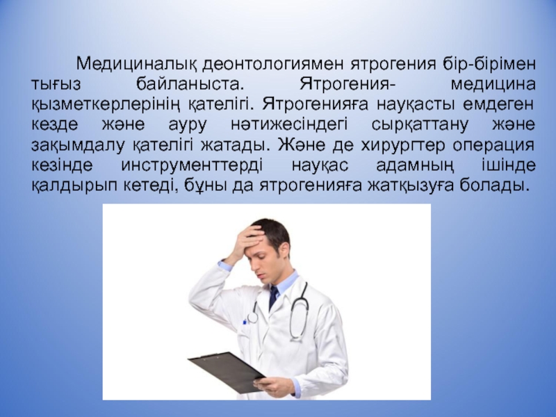 Слайд 13 Медициналық деонтологиямен ятрогения бір-бірімен тығыз байланыста. Ятрогения- медицина қызметкерлерінің қателігі.